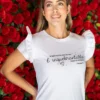 El detalle protagonista son sus mangas con boleros estructurados, que aportan volumen, movimiento y un toque romántico a tu silueta. Cada prenda de esta colección ha sido pensada para equilibrar la suavidad del diseño con la contundencia de sus mensajes inspiradores.